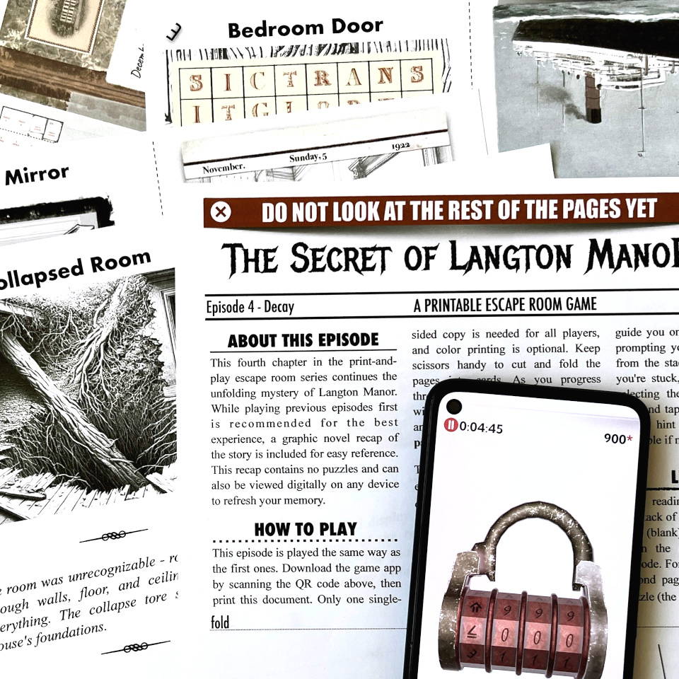 Episode 4 can be played standalone with a fully illustrated story recap (viewable on any device, no printing required). However, the full emotional impact and horror escalation are best experienced by playing the complete series in order, starting with Episode 1: Legacy – Free Printable Escape Room.